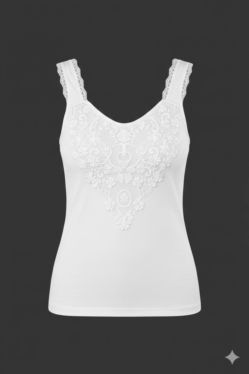 ŞAHİNLER’in şıklık ve konforu bir arada sunan Güpürlü Likralı Atlet B152, kadın iç giyiminde vazgeçilmez bir parça.