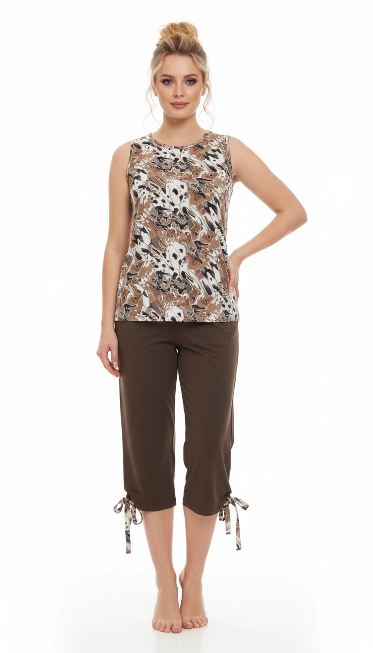 ŞAHİNLER markasının özel tasarımı olan Alaca Desenli Kolsuz Kapri 22203, rahatlığı ve şıklığı bir arada sunuyor.